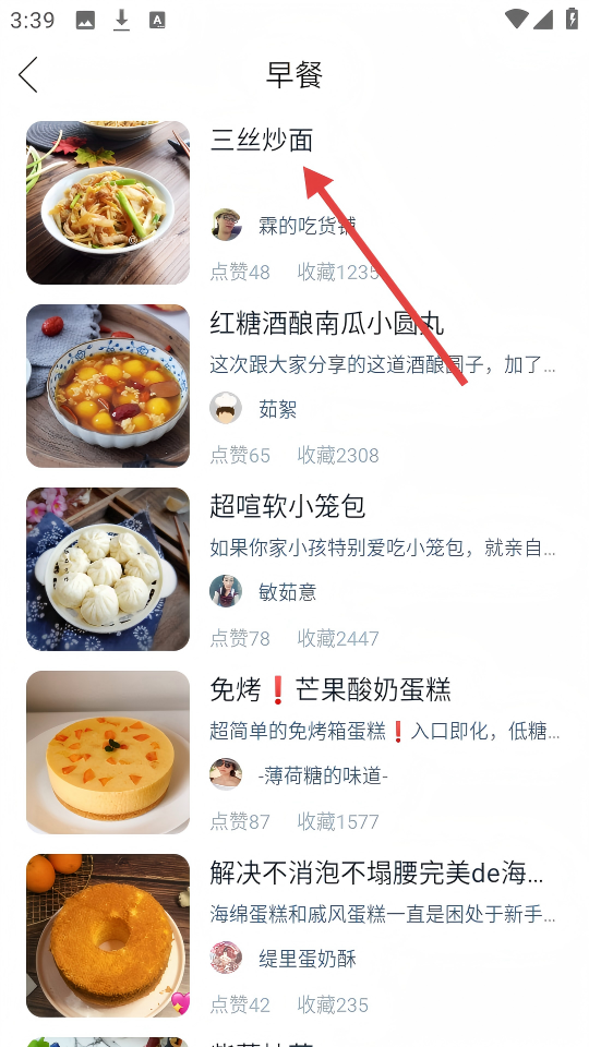 3、在早餐菜谱列表,点击【三丝炒面】,可查看该菜谱详情。