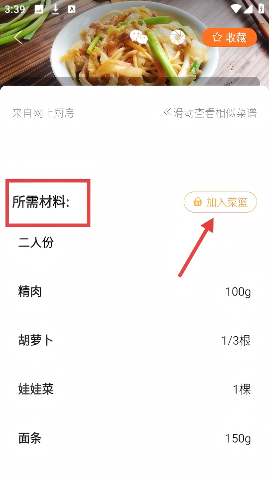4、在菜谱详情页,可查看【所需材料】,点击【加入菜篮】能添加食材。