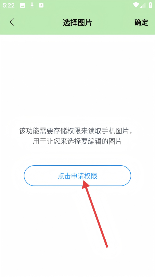2、在选择图片页面,点击【点击申请权限】,获取存储权限以读取手机图片。