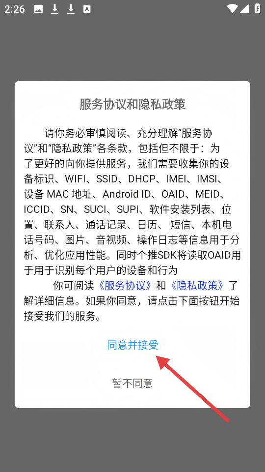 1、在弹出的【服务协议和隐私政策】窗口中,点击【同意并接受】,以继续使用应用。