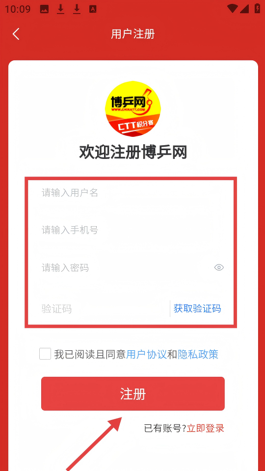 4、在【用户注册】页面,依次输入用户名、手机号、密码、获取并填写验证码,勾选协议,点击【注册】。