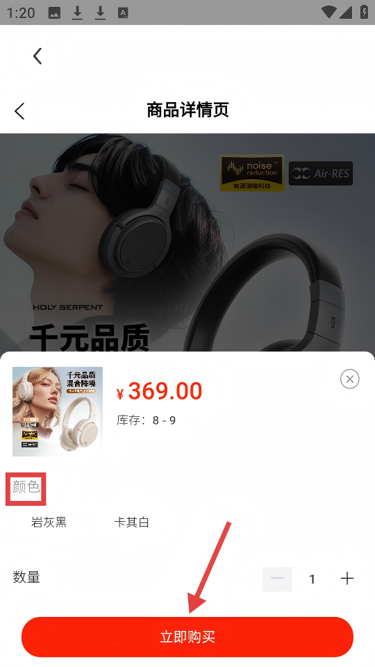 4、在弹出的商品规格选择框中,选定颜色等信息后,点击【立即购买】按钮。
