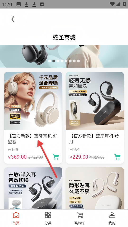 2、在蛇圣商城首页,点击【【官方新款】蓝牙耳机仰望者】商品区域进入详情页。