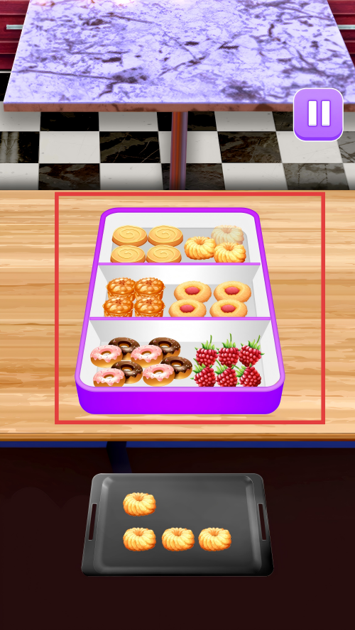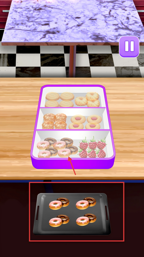 3、将下方托盘里的甜甜圈,放到上方餐盒对应区域。