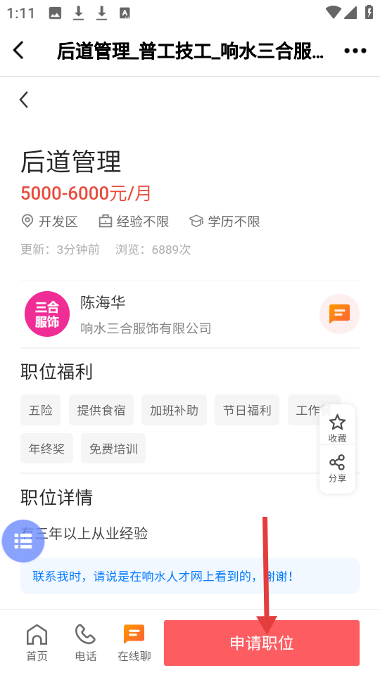 3、在职位列表中,点击【后道管理】职位,进入该职位详情页。