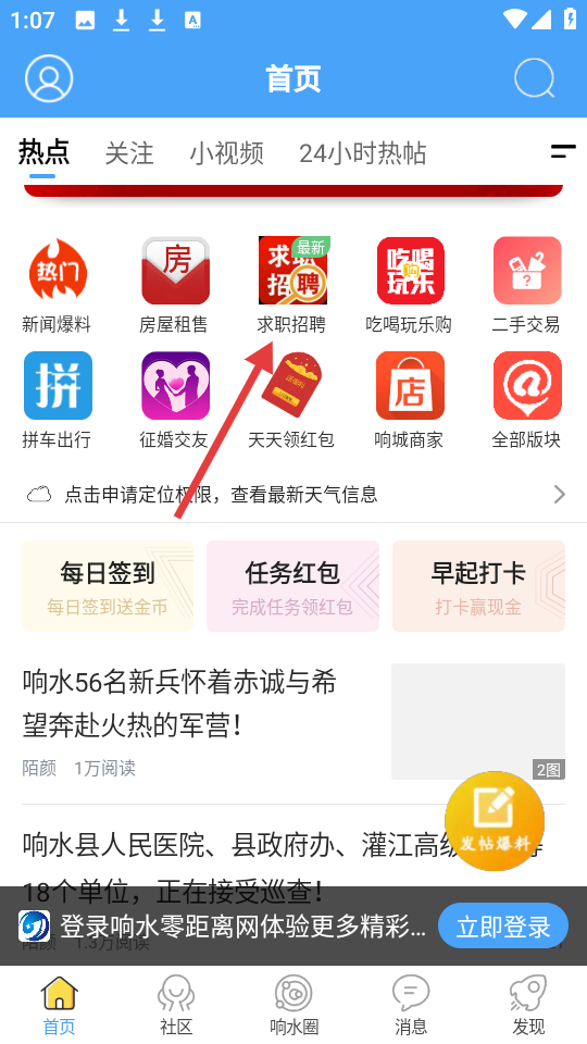 1、在应用首页,点击【求职招聘】,进入招聘相关页面。