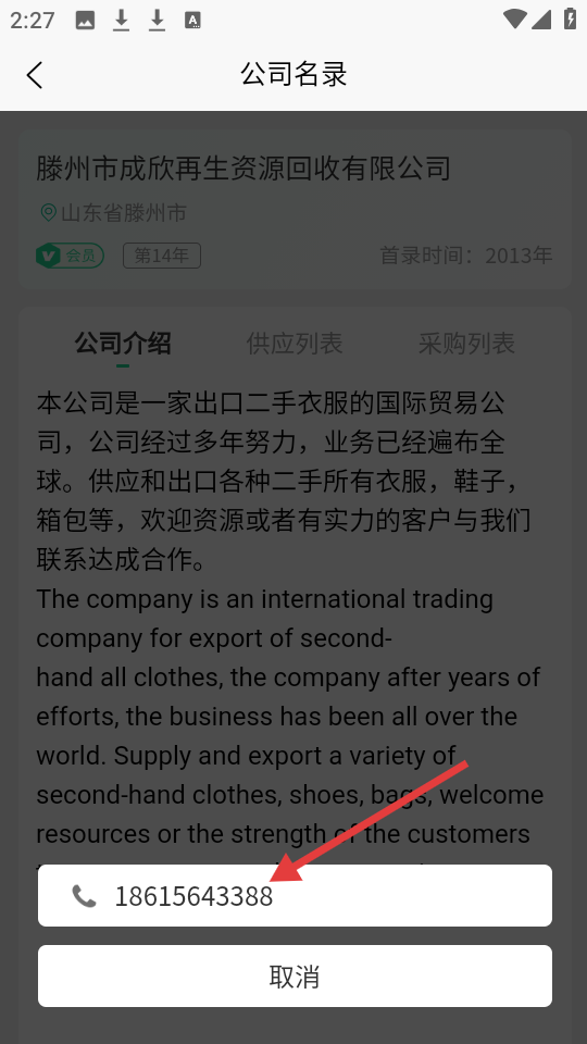4、在公司名录联系弹窗中,可查看或拨打【18615643388】。