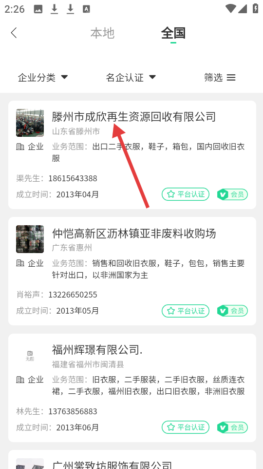 2、在全国企业名录列表里,点击【滕州市成欣再生资源回收有限公司】,进入公司名录详情页。
