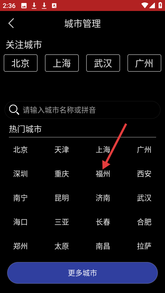 3、在城市管理页面的热门城市列表中,点击【福州】,查看福州天气。