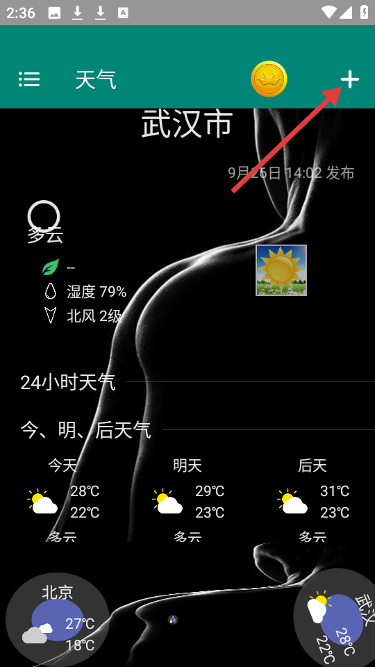 2、在武汉市天气页面,点击右上角的【+】号,进入城市管理页面。