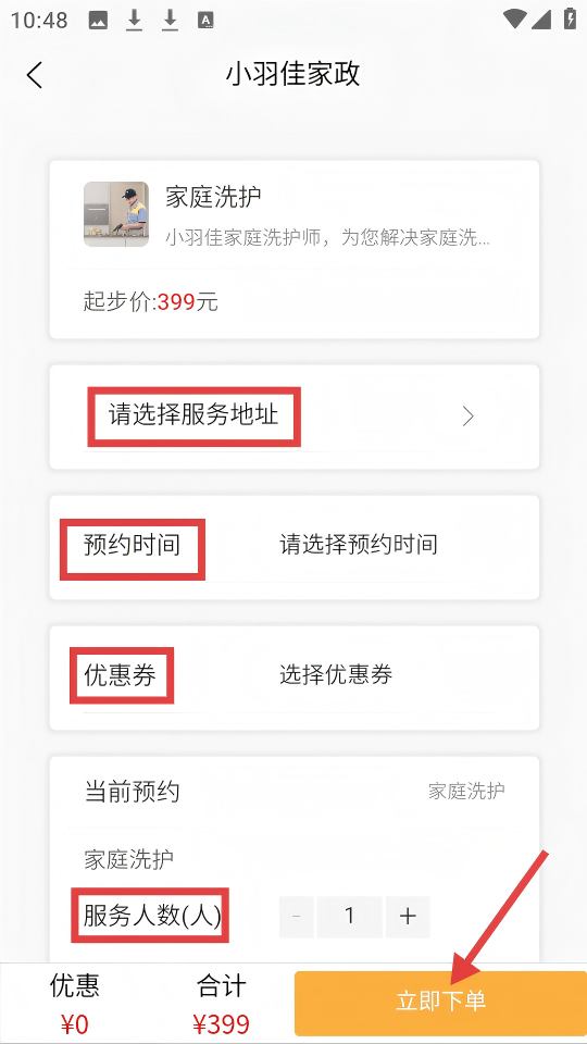 4、在【小羽佳家政】的下单页面,填写【服务地址】【预约时间】【优惠券】等信息后,点击【立即下单】。