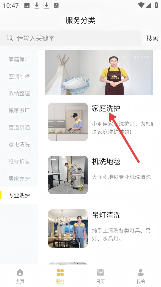 2、在【服务分类】页面,点击【家庭洗护】,进入该服务详情页。