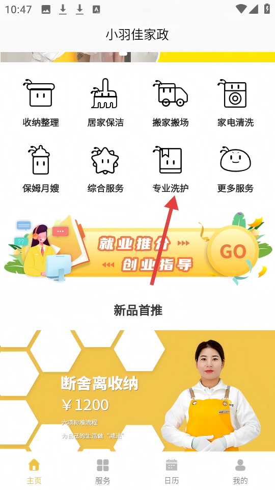 1、在【小羽佳家政】页面,点击【专业洗护】图标,进入服务分类页面。