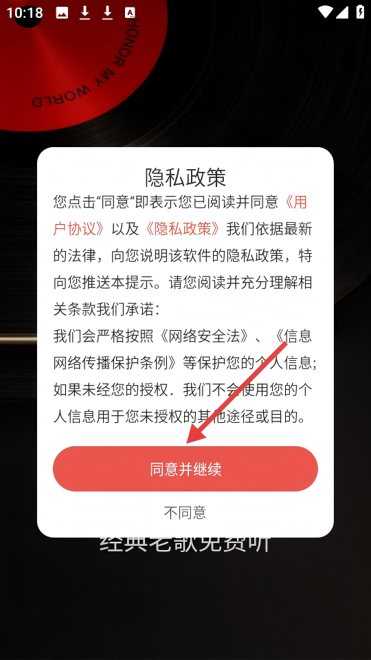 1、点击【同意并继续】按钮,即可同意隐私政策并继续使用应用。