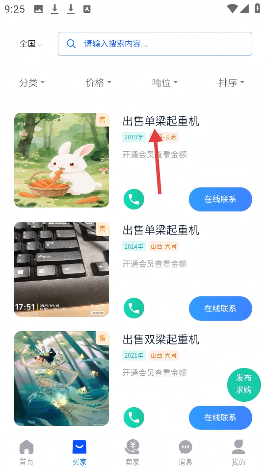2、在买家页面,点击【出售单梁起重机】的标题,查看设备详情。