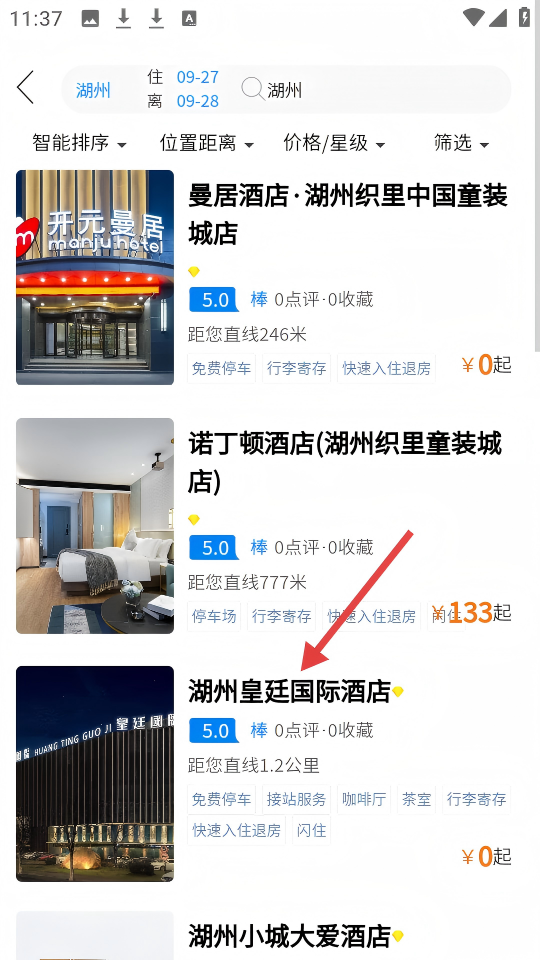 3、在酒店列表页面,点击目标酒店(如【湖州皇廷国际酒店】),进入该酒店详情页。