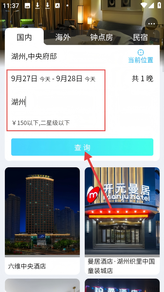 2、在酒店查询页面,选择入住离店日期、输入目的地等条件后,点击【查询】按钮,获取酒店列表。