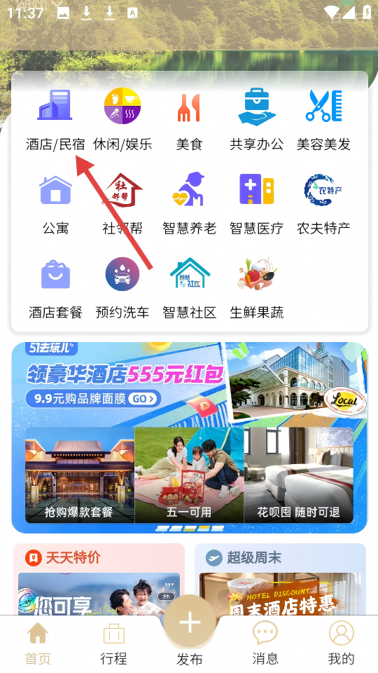 1、在应用首页,点击【酒店/民宿】图标,进入酒店民宿查询页面。