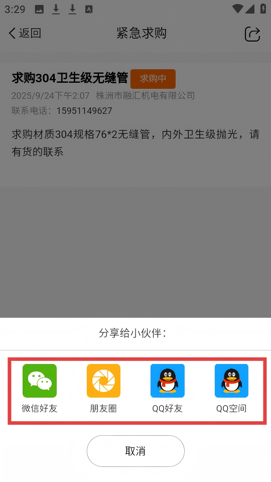 4、在紧急求购的分享界面,可选择【微信好友】【朋友圈】【QQ好友】等方式分享求购信息。