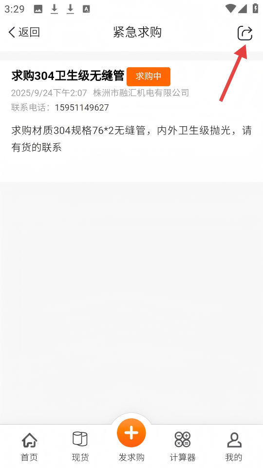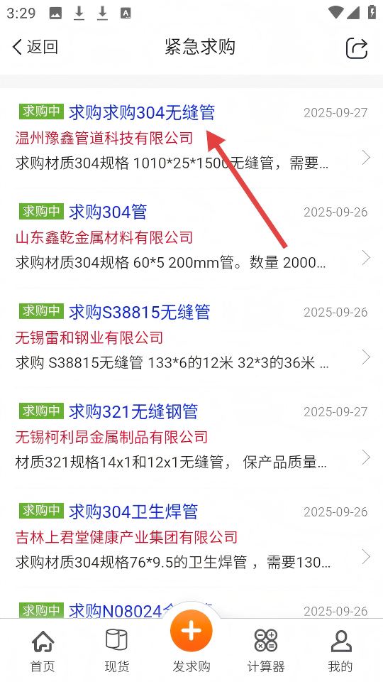 2、在紧急求购列表中,点击【求购求购304无缝管】条目,进入该求购信息的详情页。