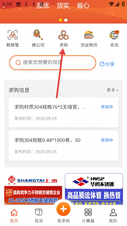 1、点击首页的【求购】选项,进入紧急求购列表页面。