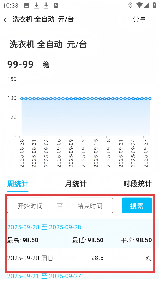 4、在洗衣机价格页面,可查看价格统计,可选择开始时间和结束时间后点击【搜索】,查看信息。
