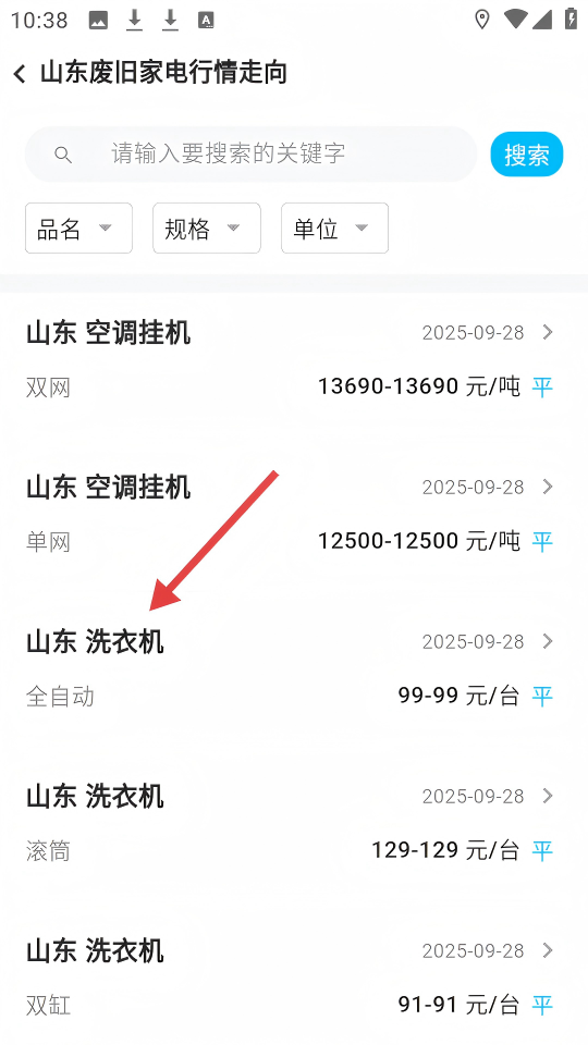 3、在山东废旧家电行情走向页面,点击【山东洗衣机】,可查看山东洗衣机的价格走势。