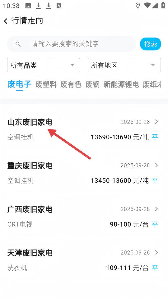 2、在行情走向页面,点击【山东废旧家电】,可查看山东废旧家电的详细行情走向。
