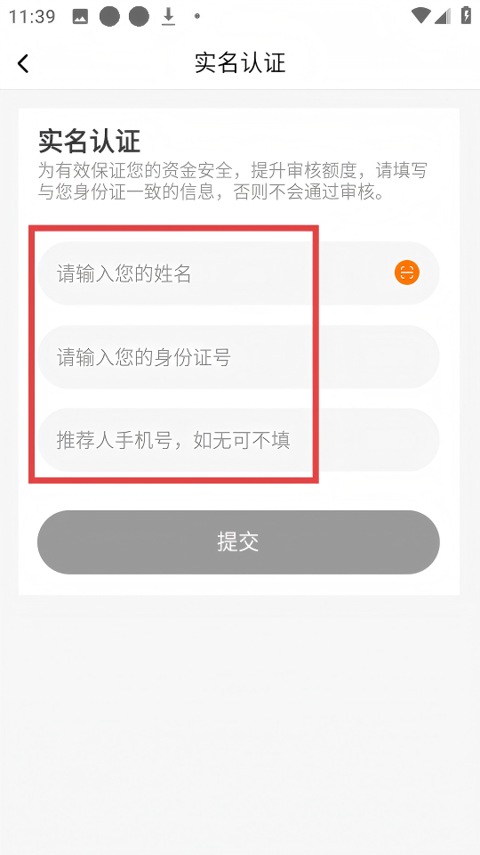 4、在实名认证页面,填写【请输入您的姓名】【请输入您的身份证号】等信息后,点击提交,可完成实名认证。