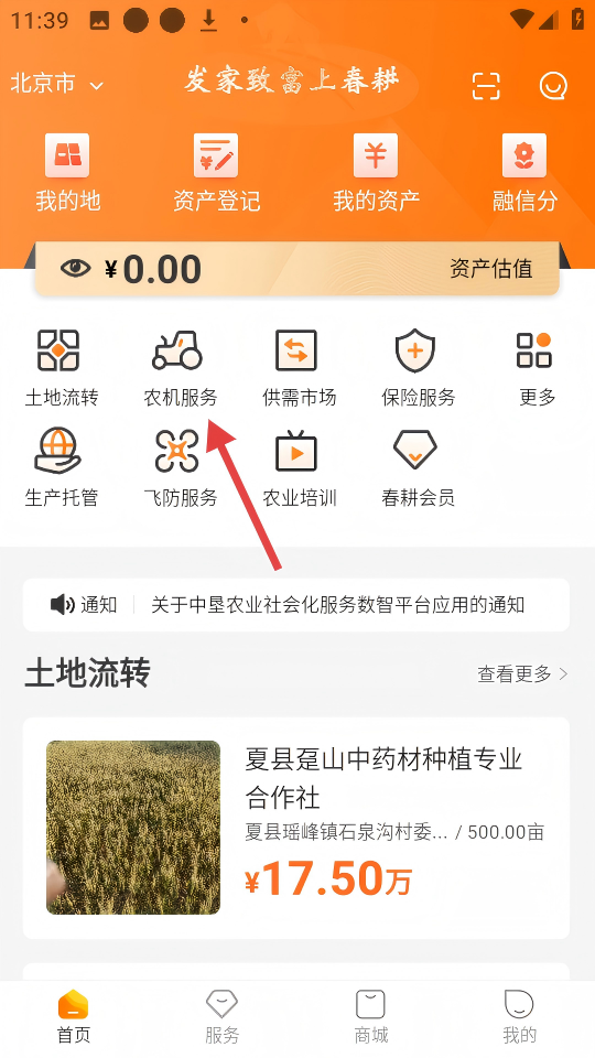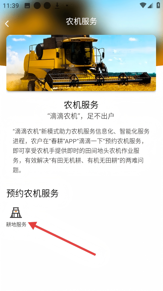 2、在农机服务页面,点击【耕地服务】选项,可进入耕地服务页面。