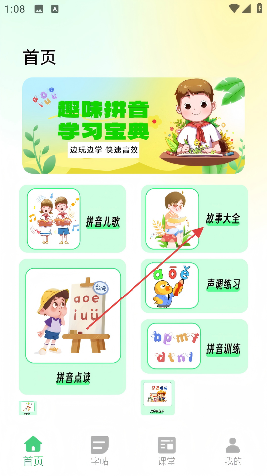 4、启蒙资源丰富:提供拼音启蒙相关资源与专属线上课堂,支持孩子提前学习拼音,还能通过儿童故事积累知识。