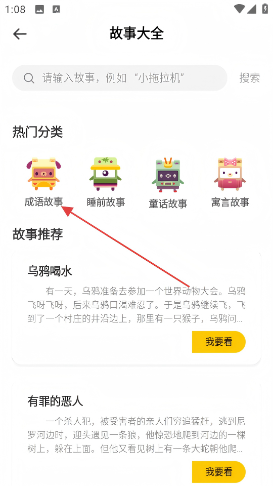 2、进入【故事大全】页面后,点击【成语故事】分类,查看成语故事列表。