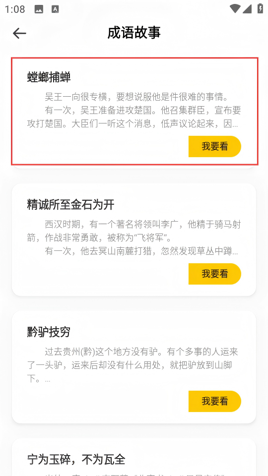 3、在成语故事列表里,找到【螳螂捕蝉】,点击其对应的【我要看】按钮。