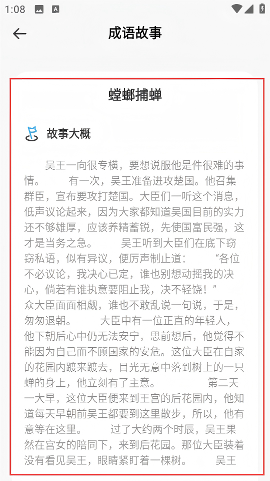 4、点击后,即可查看【螳螂捕蝉】的完整故事内容,了解故事大概。