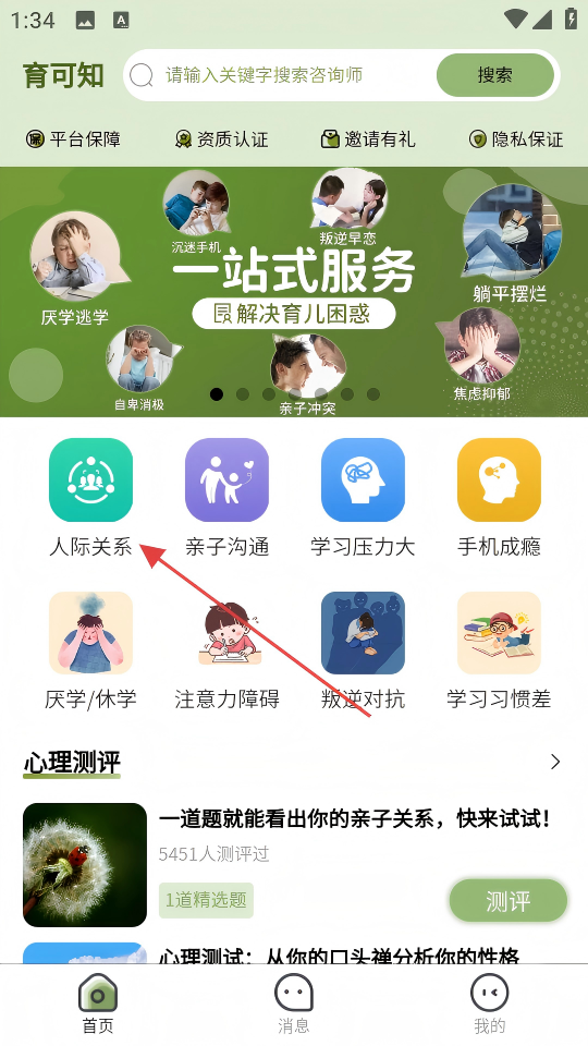 1、在【育可知】首页,点击【人际关系】服务分类进入。