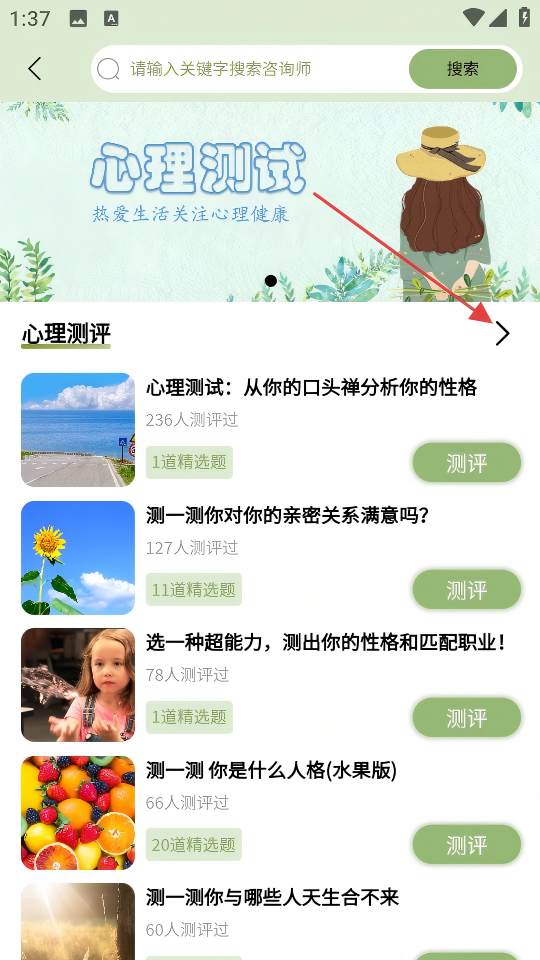 2、进入心理测试页面后,点击右侧箭头浏览更多测评内容,挑选想参与的测评。