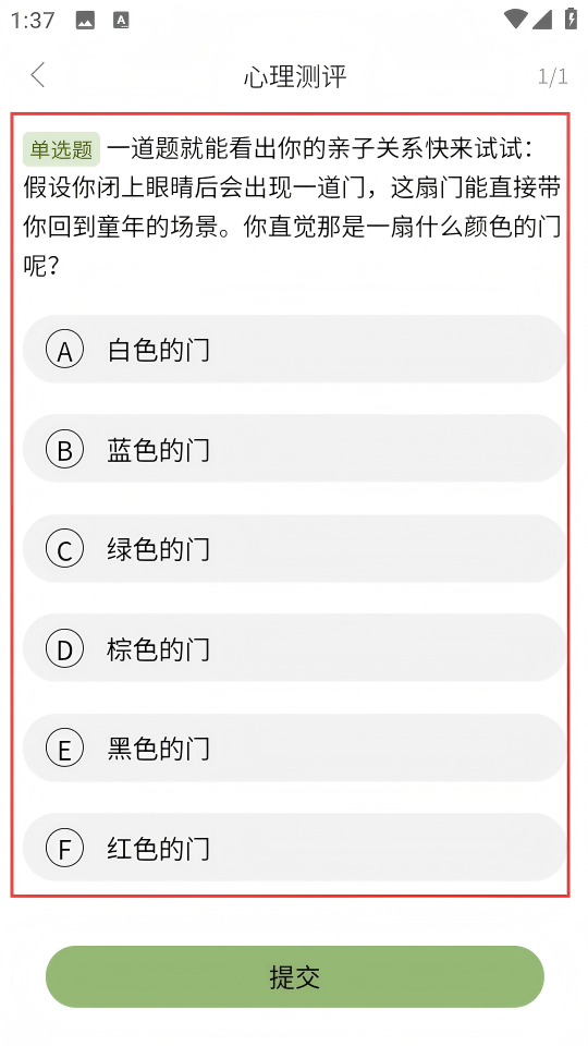 4、进入测评后,会看到单选题,选好后点击【提交】完成测评。
