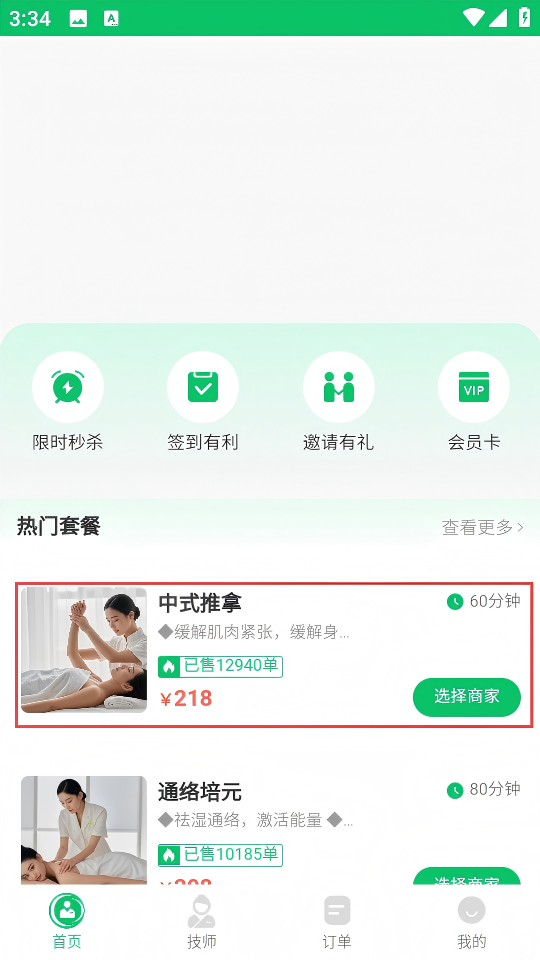 1、在首页“热门套餐”区域,找到【中式推拿】项目,点击进入该项目详情页。