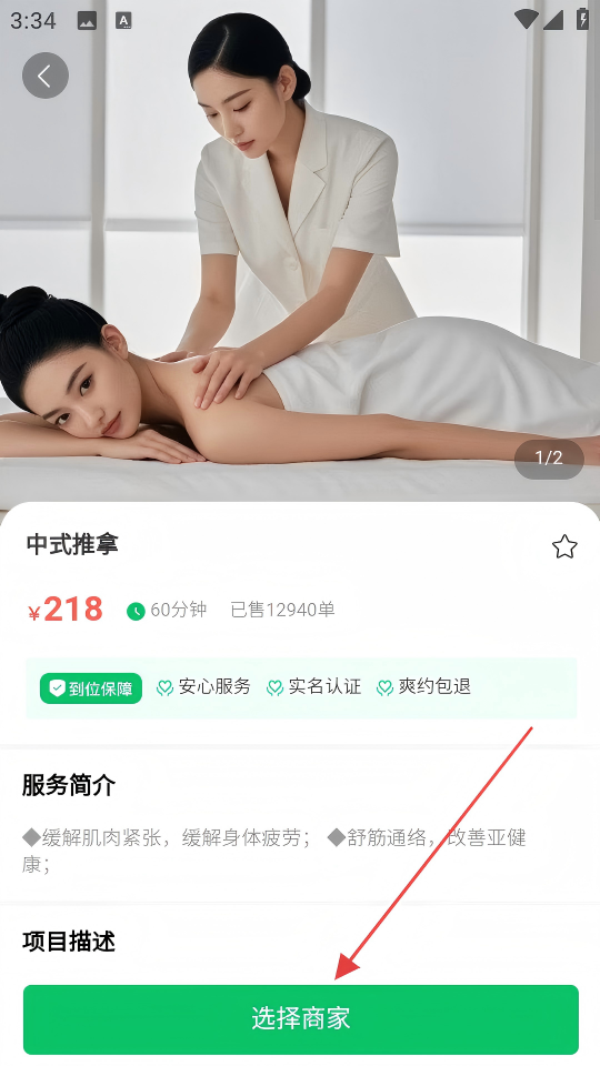 2、在【中式推拿】详情页,查看服务简介后,点击【选择商家】按钮,进入选择人员页面。