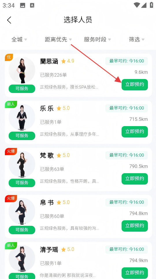 3、在选择人员页面,挑选合适的服务人员,点击其右侧的【立即预约】按钮。