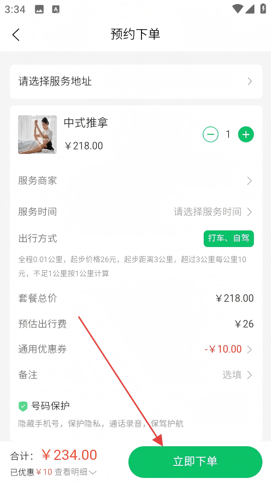 4、进入预约下单页面,选择服务地址、服务时间等,点击【立即下单】完成预约。