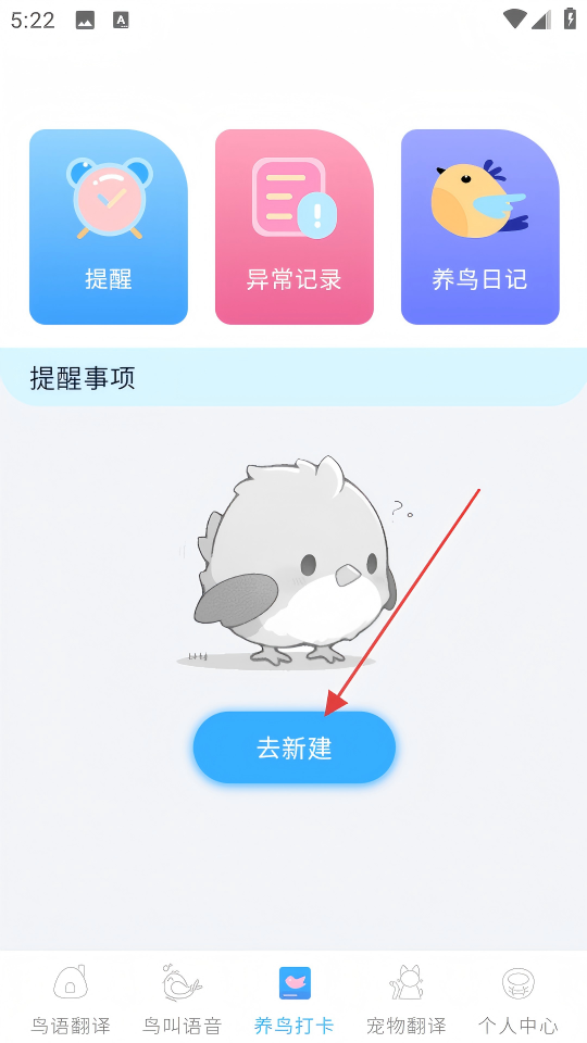 2、在养鸟打卡页面点击【去新建】,进入添加提醒页面。