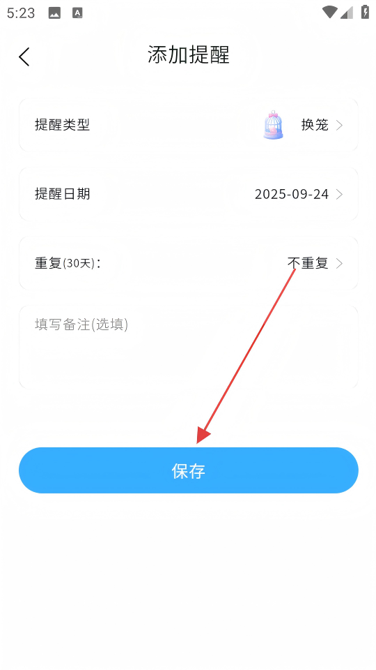 3、在添加提醒页面,设置提醒类型、日期等信息后,点击【保存】按钮。