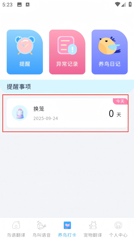 4、保存后,即可在养鸟打卡页面的提醒事项中,看到提醒记录。