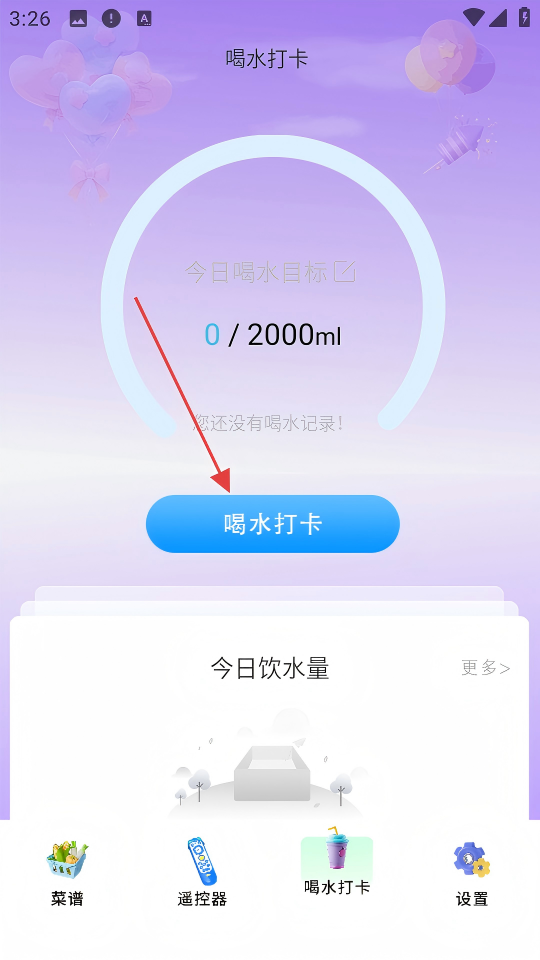 1、点击底部【喝水打卡】,进入喝水打卡页面,可查看今日喝水目标及进度。