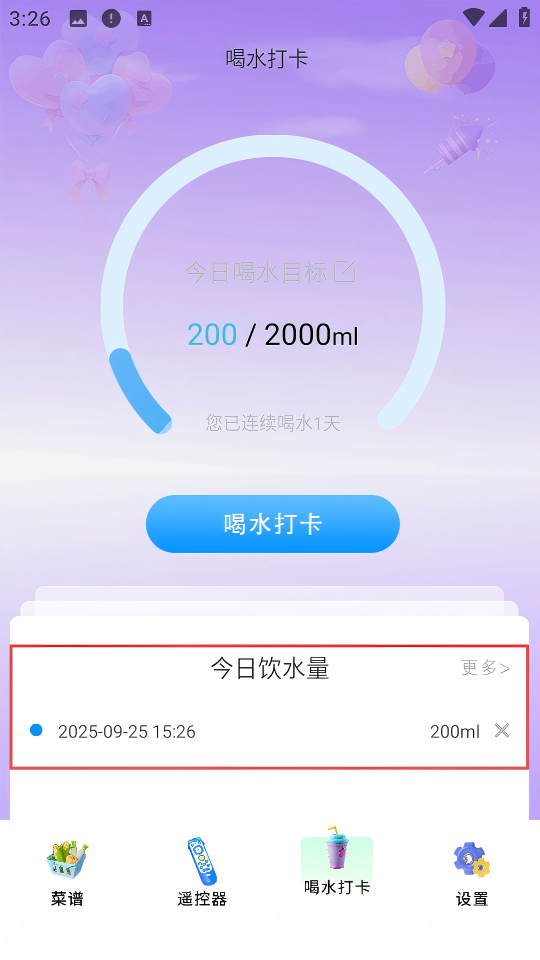 4、添加后,即可在喝水打卡页面看到“今日饮水量”打卡记录,且今日喝水进度更新。