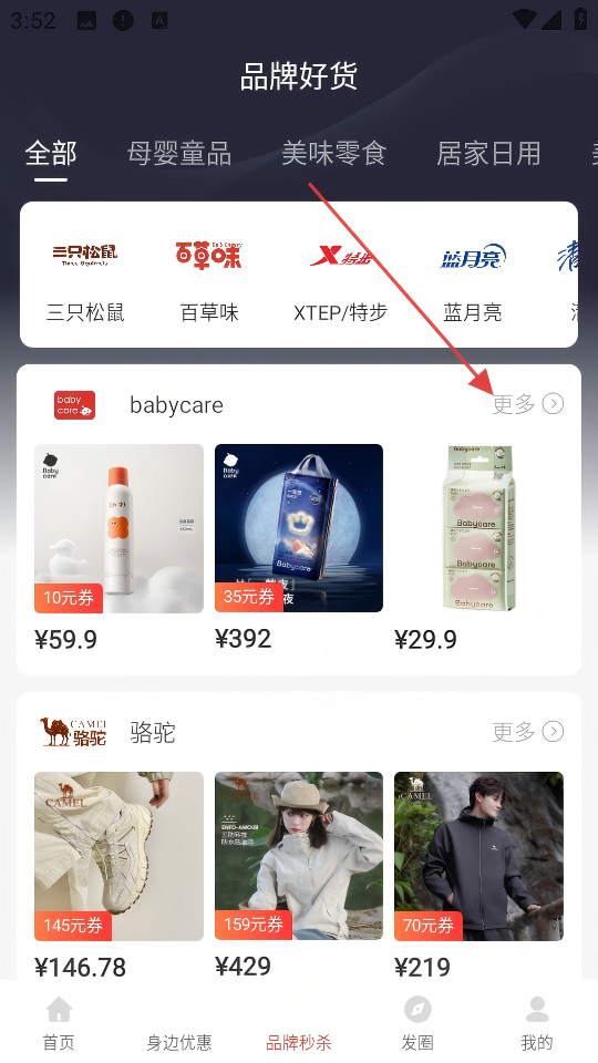 2、在品牌好货页面点击babycare品牌旁的【更多】,进入babycare品牌专区页面。