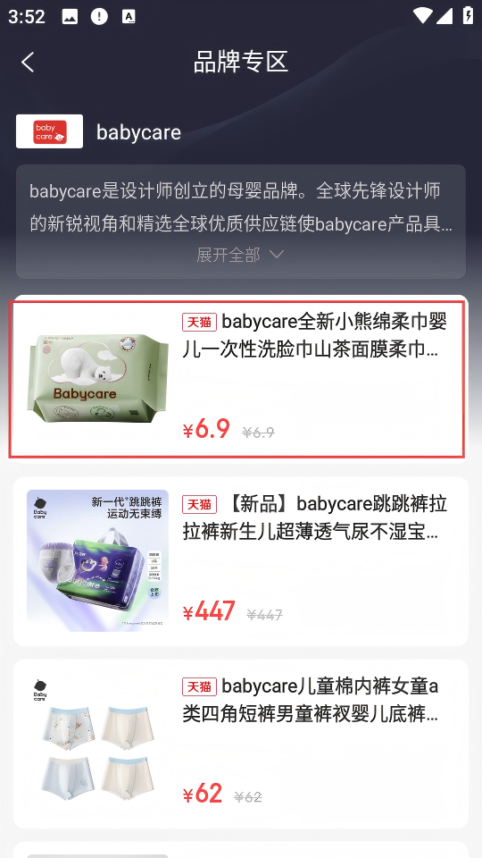 3、在babycare品牌专区,选择商品,进入该商品详情页面。