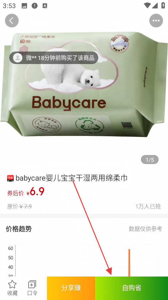 4、在商品详情页,点击【自购省】,即可进行该商品的自购操作。