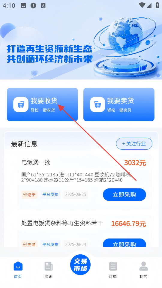 1、点击【我要收货】,进入收货页面,可看到各类待采购的再生资源商品。
